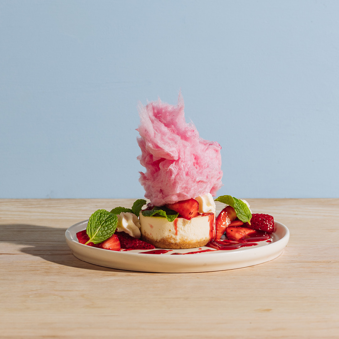 NY Style Cheesecake, fresh strawberries, strawberry coulis, fairy floss, whipped cream, mint and freeze-dried raspberries. But who are we to disagree?