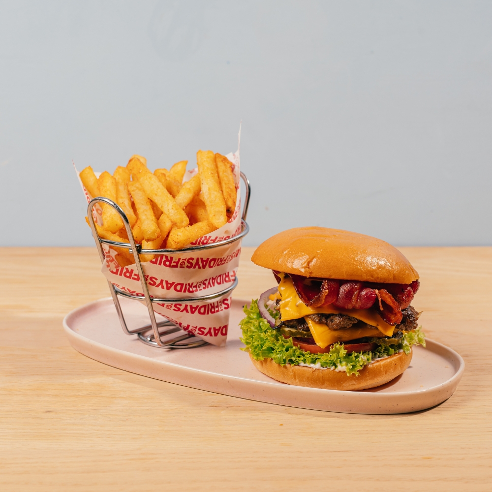 Smash patty, our FRIDAYS™ Signature Whiskey Glaze, melted American-style cheese, lettuce, tomato, red onion, pickles and roasted garlic aioli. More bang. More smash.